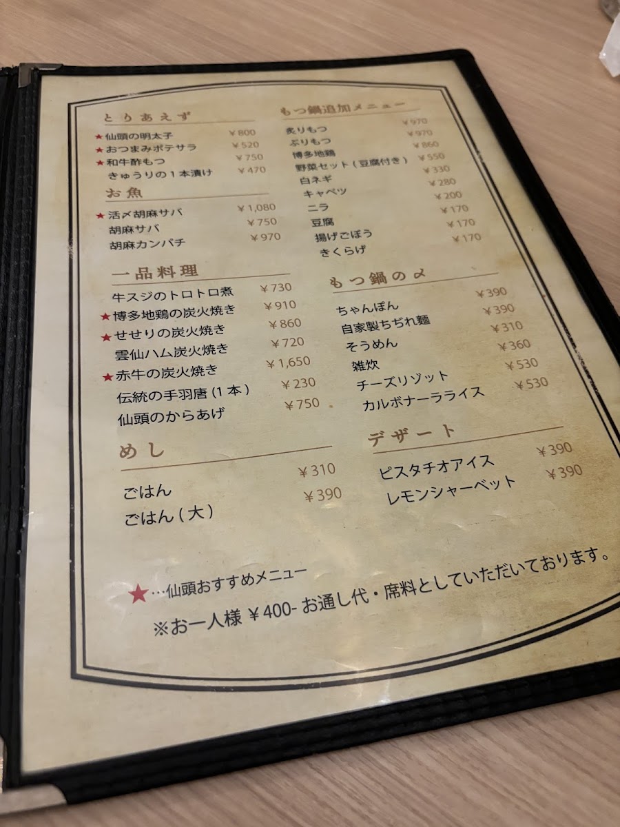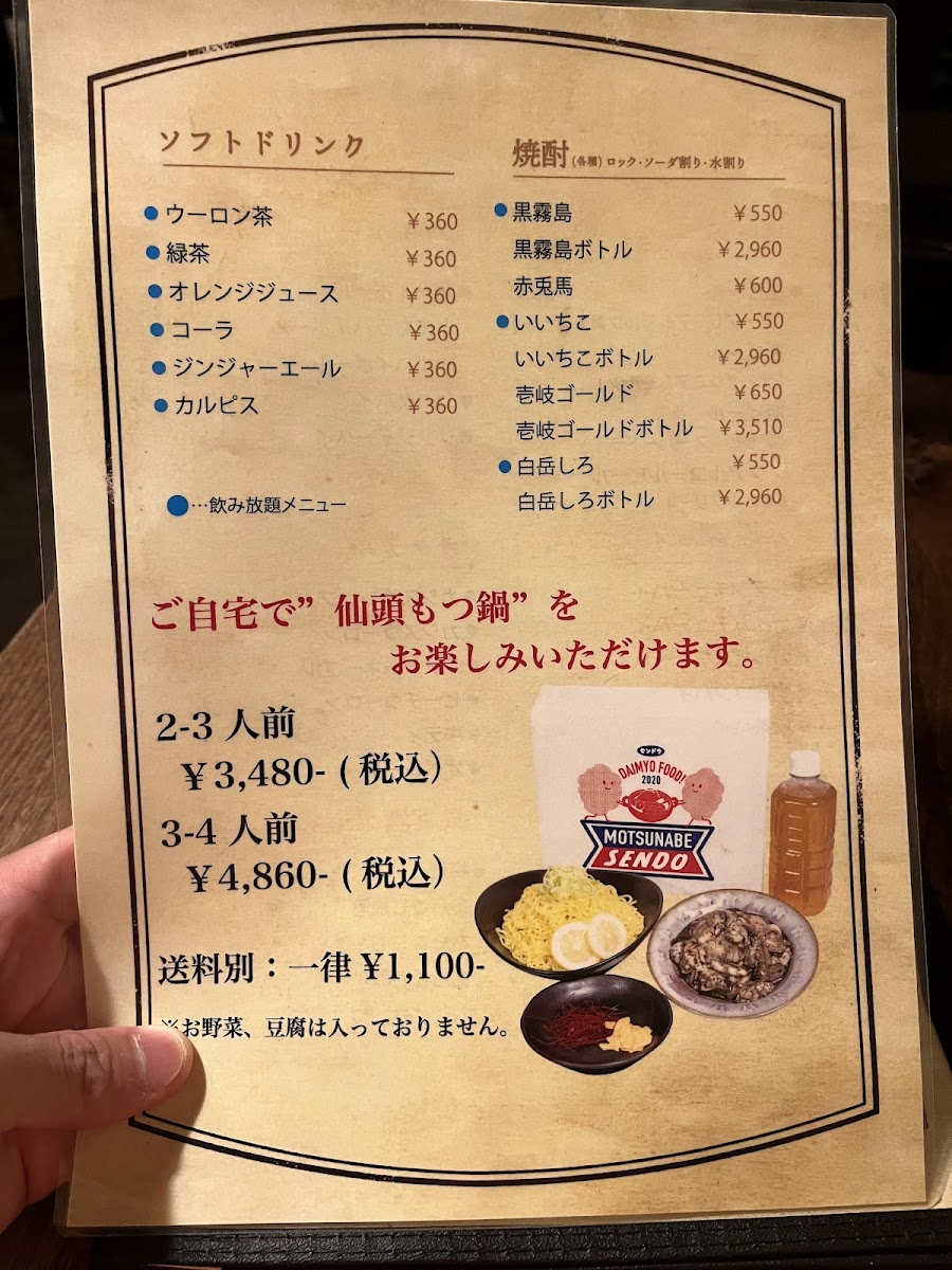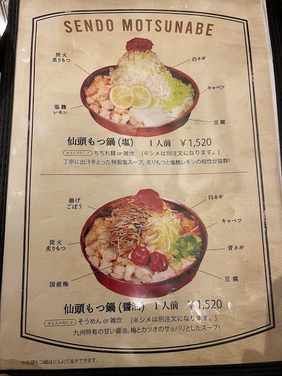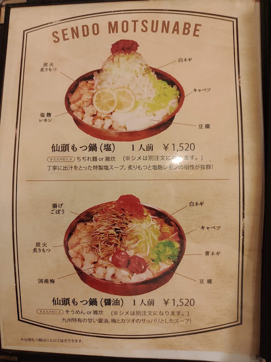 From a reviewer’s perspective, the menu at Motsunabe Sendo Daimyo, located at 2 Chome-2-48 Daimyo, Chuo Ward, Fukuoka, is a well-rounded reflection of Hakata’s rich food culture, combining generosity, flexibility, and local flavors into a satisfying dining experience. The restaurant’s course-focused menu is especially appealing for groups, with thoughtfully curated options that balance signature dishes and value. The premium 博多ゴマサバ&博多地鶏炭火焼き付 2H飲放題コース 6,500円 stands out as a comprehensive introduction to regional specialties, pairing Hakata sesame mackerel and charcoal-grilled local chicken with a full two hours of all-you-can-drink, making it ideal for guests seeking both quality and indulgence. For those who want variety at a slightly more accessible price point, the 選べるもつ鍋&仙頭から揚げ 全8品+2H飲放題付コース 5,500円 delivers excellent balance, combining customizable motsunabe with the restaurant’s popular Sendo-style fried chicken across eight satisfying dishes. The menu also caters to diners who prefer more flexibility in budget and beverage choices, as seen in 選べるもつ鍋付き(全10品)5000円※+1500円で飲み放題OK and 選べるもつ鍋付き(全8品)4000円※+1500円で飲み放題OK, both of which allow guests to add an all-you-can-drink option if desired. Overall, the menu feels carefully designed to accommodate different appetites, occasions, and spending levels, while consistently highlighting the restaurant’s core strength-rich, flavorful motsunabe. As a conclusion, Motsunabe Sendo Daimyo’s menu succeeds in being both approachable and deeply rooted in local cuisine, making it a reliable and memorable choice for anyone looking to experience Fukuoka-style hot pot dining.