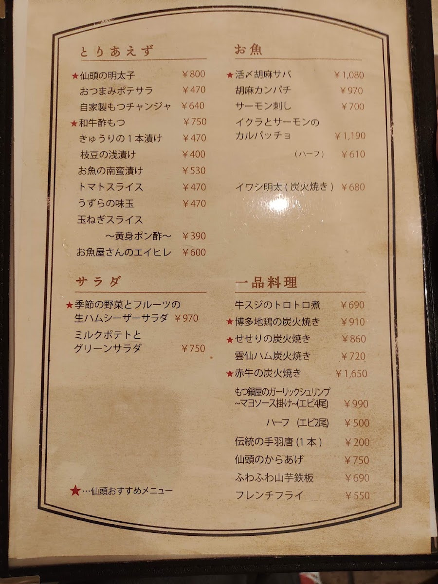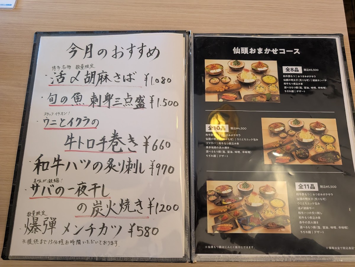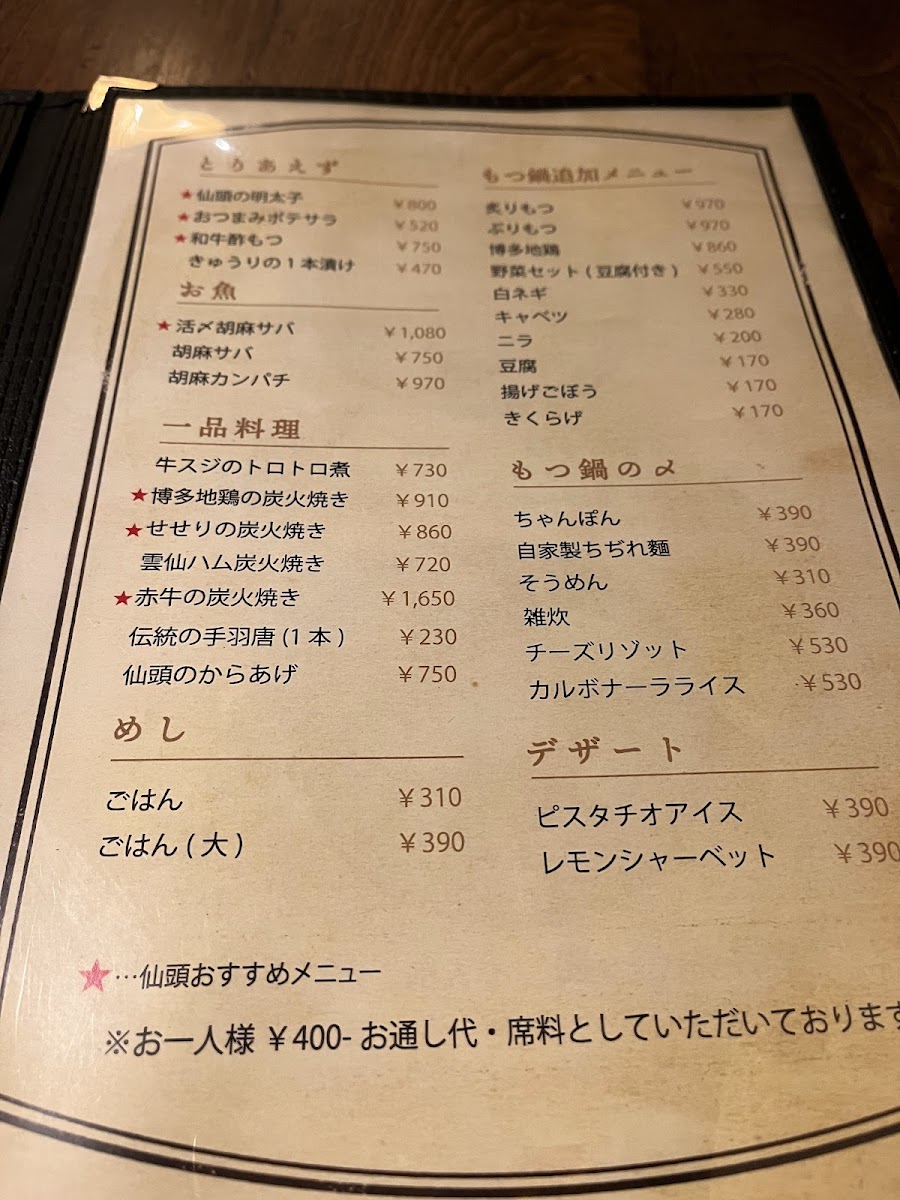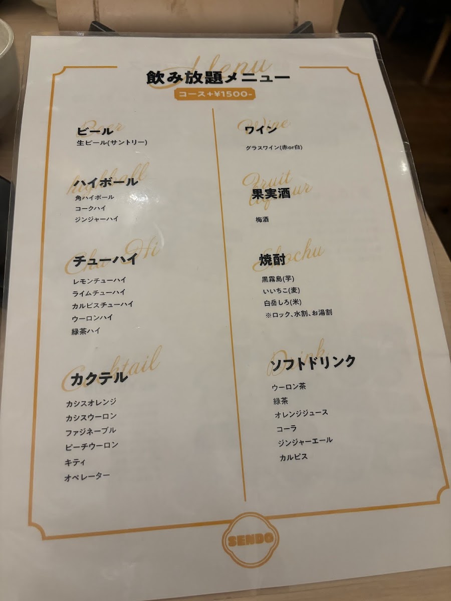 From a reviewer’s perspective, the menu at Motsunabe Sendo Daimyo, located at 2 Chome-2-48 Daimyo, Chuo Ward, Fukuoka, is a well-rounded reflection of Hakata’s rich food culture, combining generosity, flexibility, and local flavors into a satisfying dining experience. The restaurant’s course-focused menu is especially appealing for groups, with thoughtfully curated options that balance signature dishes and value. The premium 博多ゴマサバ&博多地鶏炭火焼き付 2H飲放題コース 6,500円 stands out as a comprehensive introduction to regional specialties, pairing Hakata sesame mackerel and charcoal-grilled local chicken with a full two hours of all-you-can-drink, making it ideal for guests seeking both quality and indulgence. For those who want variety at a slightly more accessible price point, the 選べるもつ鍋&仙頭から揚げ 全8品+2H飲放題付コース 5,500円 delivers excellent balance, combining customizable motsunabe with the restaurant’s popular Sendo-style fried chicken across eight satisfying dishes. The menu also caters to diners who prefer more flexibility in budget and beverage choices, as seen in 選べるもつ鍋付き(全10品)5000円※+1500円で飲み放題OK and 選べるもつ鍋付き(全8品)4000円※+1500円で飲み放題OK, both of which allow guests to add an all-you-can-drink option if desired. Overall, the menu feels carefully designed to accommodate different appetites, occasions, and spending levels, while consistently highlighting the restaurant’s core strength-rich, flavorful motsunabe. As a conclusion, Motsunabe Sendo Daimyo’s menu succeeds in being both approachable and deeply rooted in local cuisine, making it a reliable and memorable choice for anyone looking to experience Fukuoka-style hot pot dining.